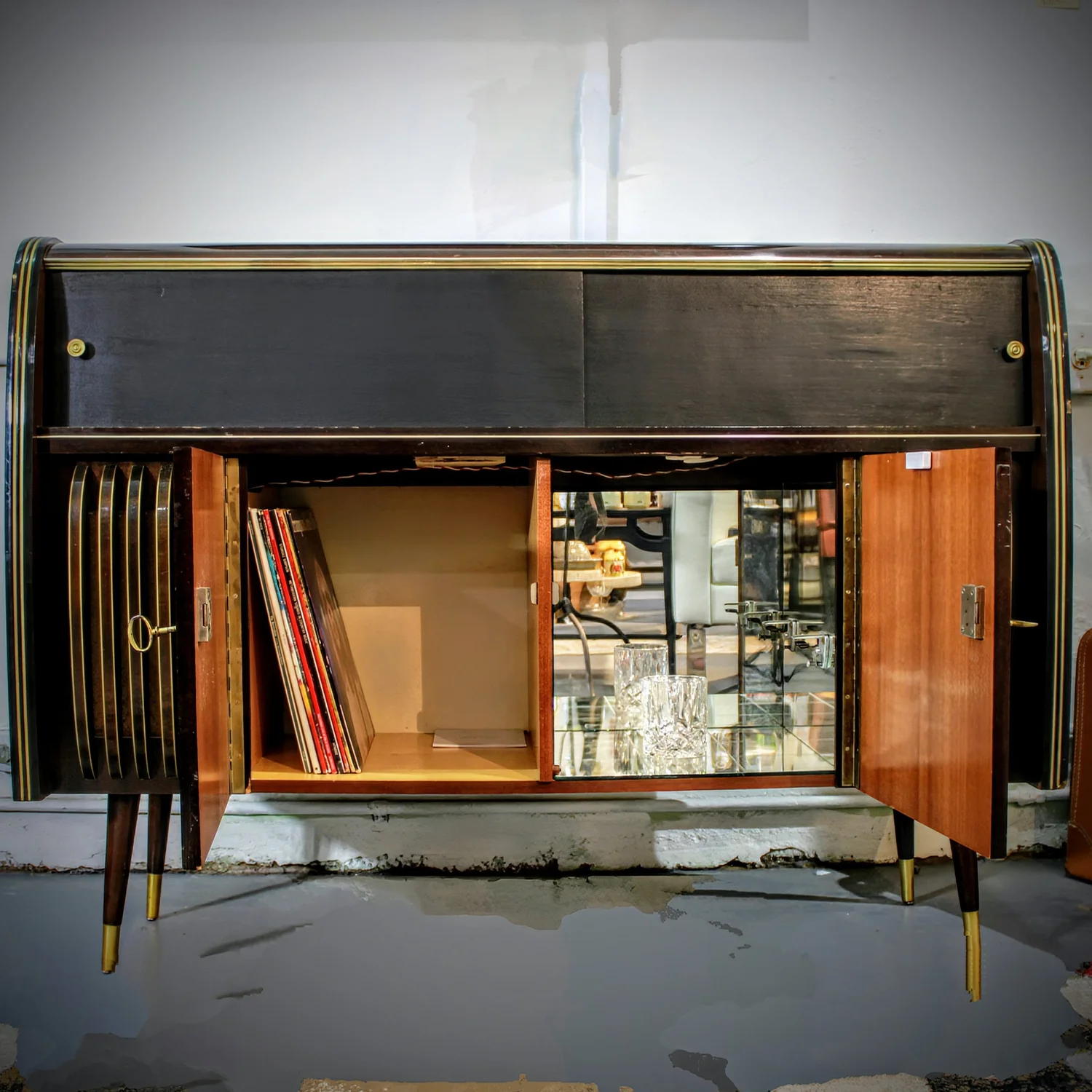 “Klaus” is a vintage Blaupunkt masterpiece reimaged with a custom Satin Black and High-Gloss wood finish. Open the doors, and you’ll find a mirrored cocktail bar and vinyl storage. But the real upgrade is the sound.